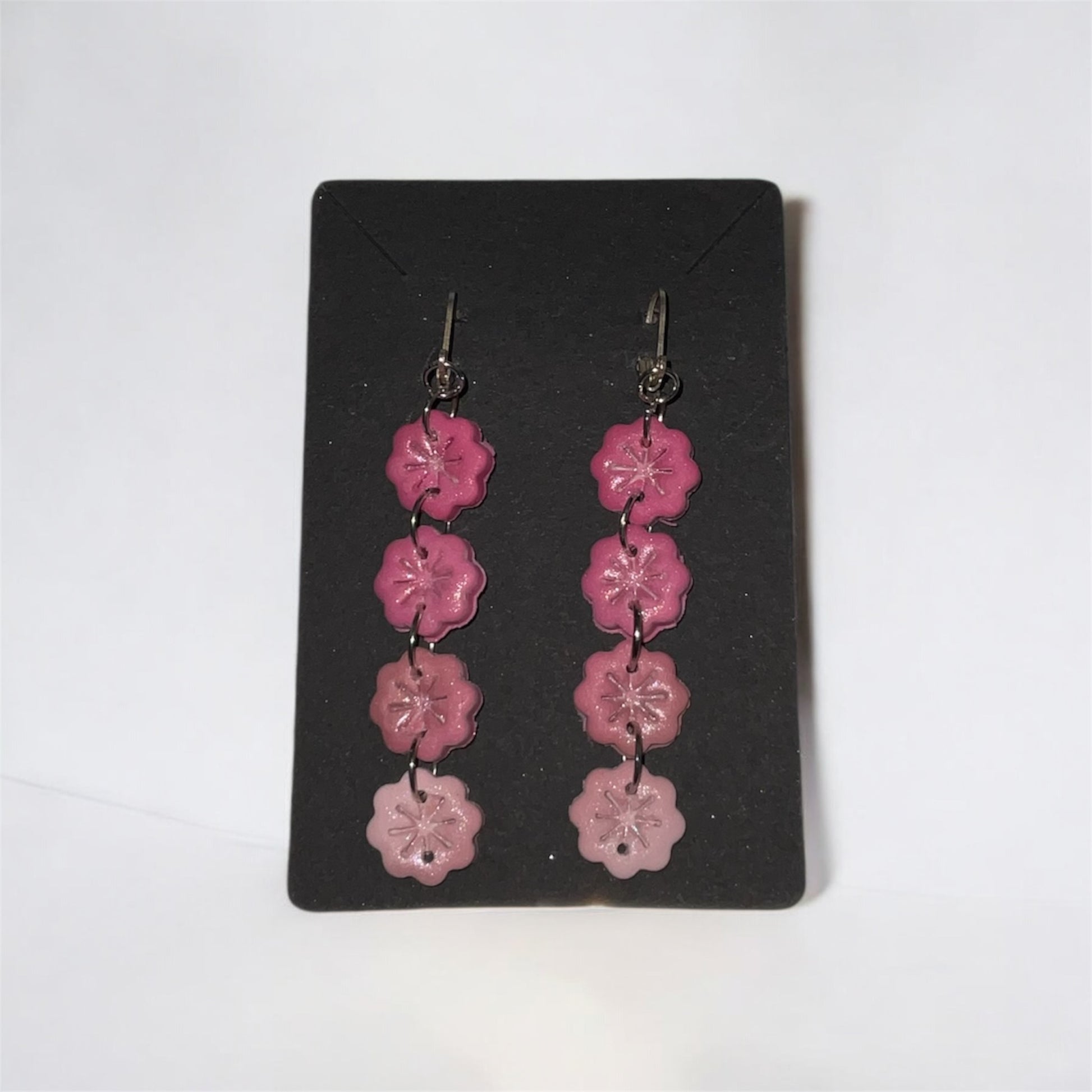 Bring a soft, feminine touch to your look with these stunning handcrafted gradient pink flower earrings. Each earring features a cascading row of delicate flowers that transition from deep rose to light blush, creating an elegant ombré effect. Lightweight yet eye-catching, these earrings add a graceful floral flair to any outfit.