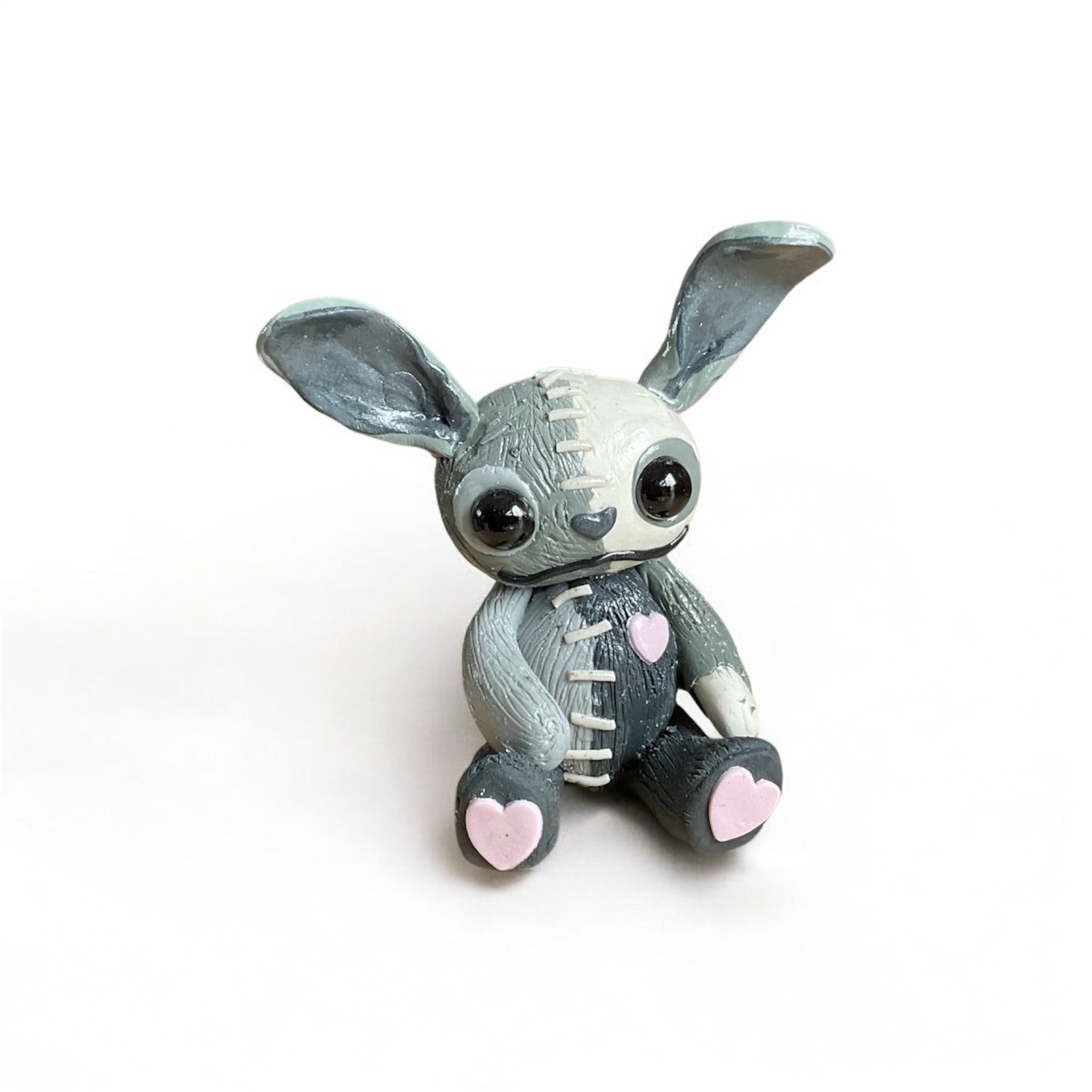 Meet the Stitch Heart Bunny, a perfectly imperfect little creature that blends spooky charm with soft-hearted sweetness. Handcrafted with care, this polymer clay bunny features textured grey tones, oversized ears, stitched detailing, and pink heart accents on its chest and paws.